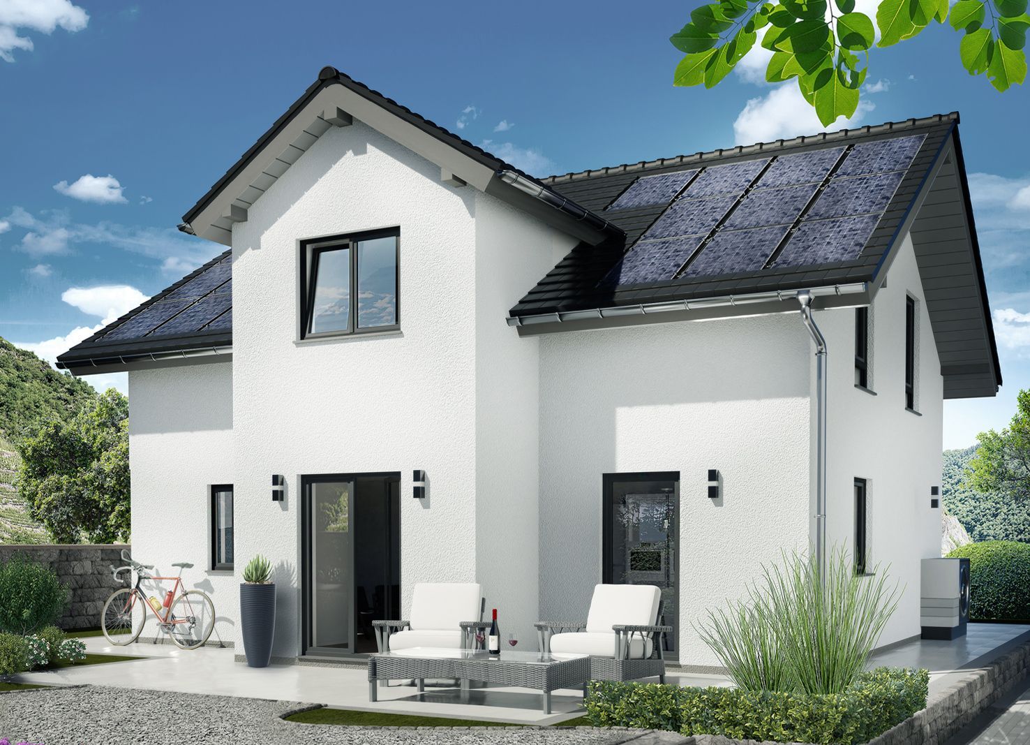 Der zusätzliche Giebel, der wahlweise auf der Vorder- oder Rückseite geplant werden kann, verleiht Ihrem neuen Eigenheim eine besonders attraktive Struktur und bietet Platz für ein weiteres Schlaf- oder Arbeitszimmer. So sind Sie auf alles, was vielleicht noch kommt, bestens vorbereitet. Auf Wunsch mit Photovoltaikanlage. je nach Standort und Bauausrichtung.