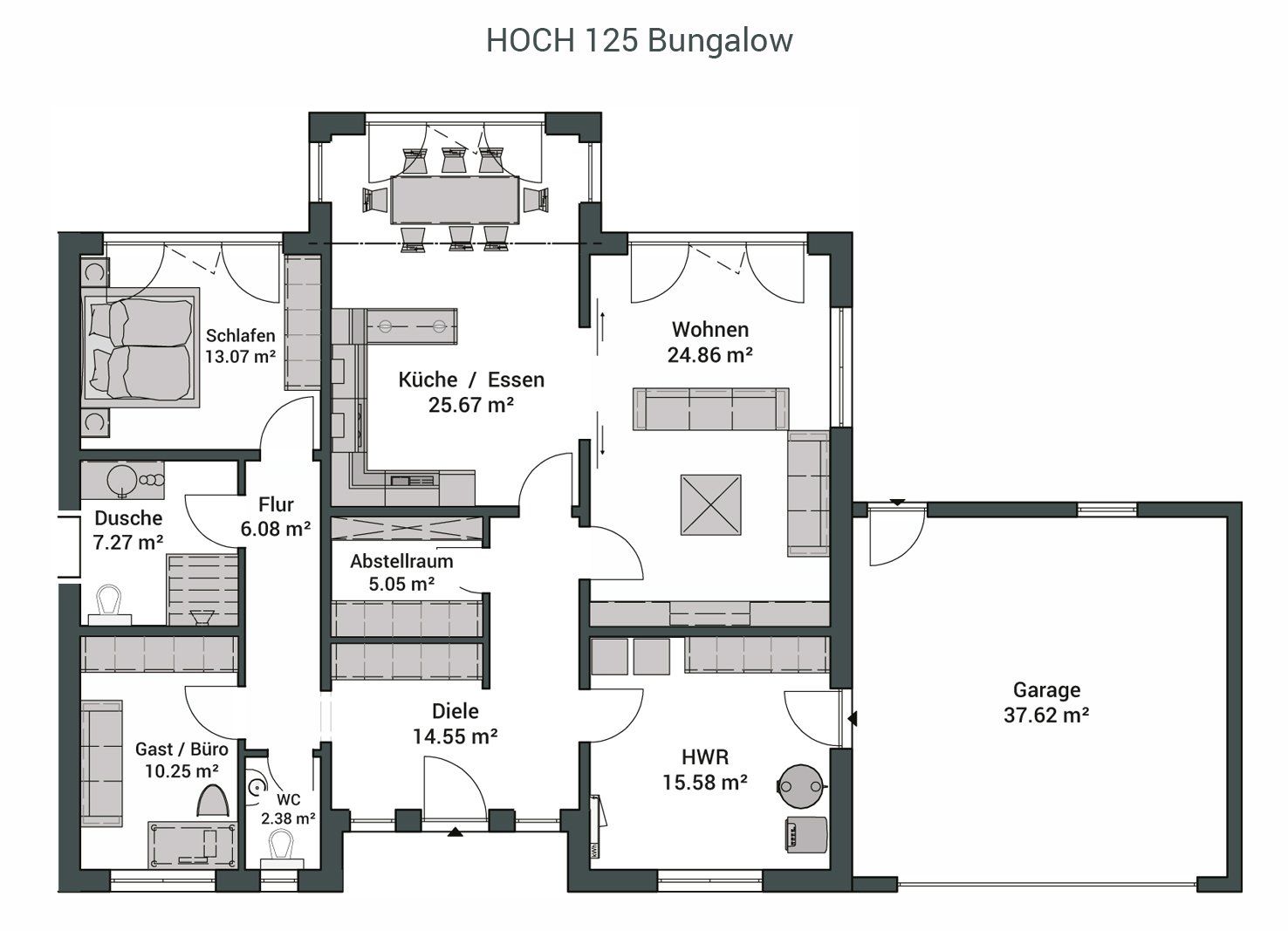 Wohnen und wohlfühlen auf einer Ebene. Alle HOCH MASSIVHAUS Bungalows bieten Ihnen barrierefreies Wohnen auf einer Ebene. Die ebenerdigen Grundrisse lassen sich genau auf Ihre persönlichen Wünsche und Bedürfnissen anpassen. So ist das HOCH MASSIVHAUS Bungalow-Konzept für jeden Lebensabschnitt bestens geeignet.